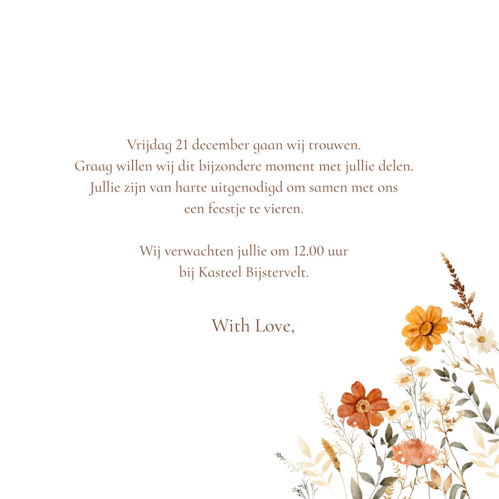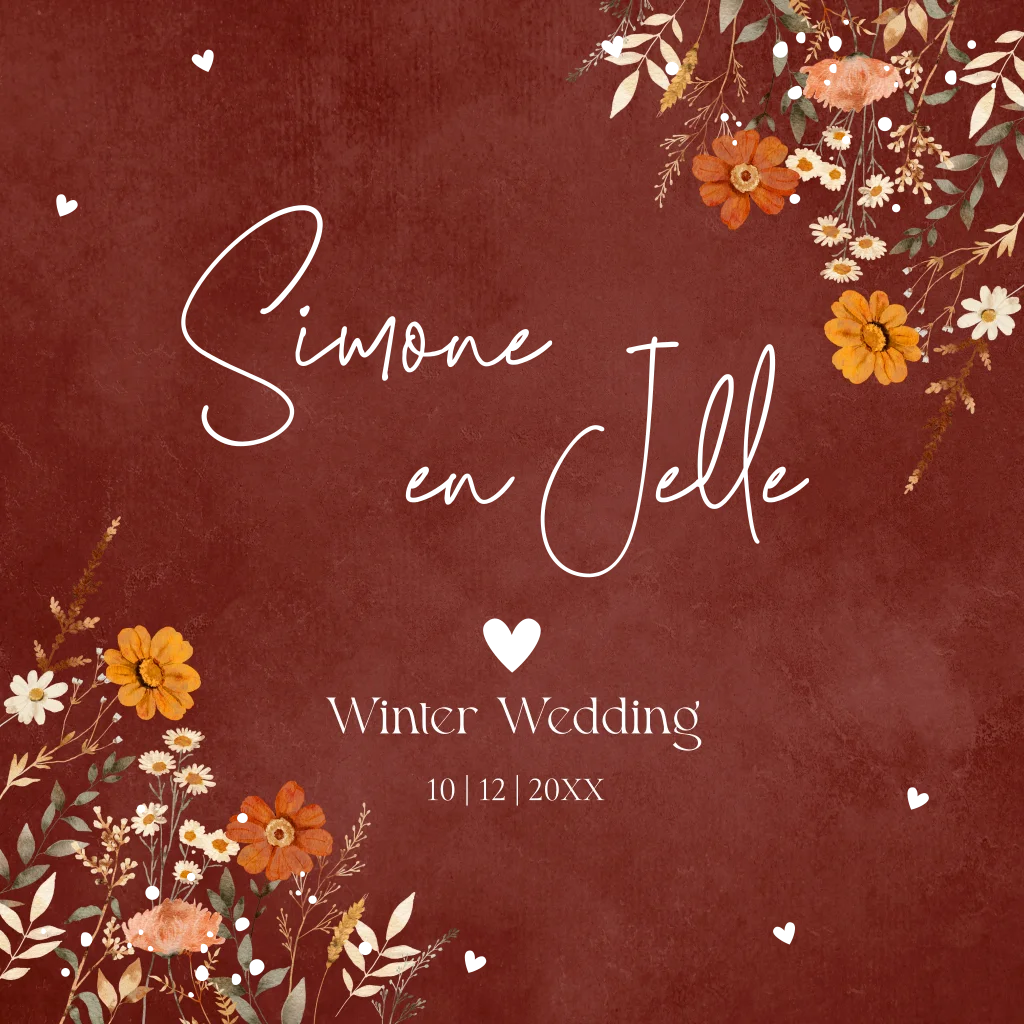 Winter wedding trouwkaart roodbruin met bloemen en goudfolie.