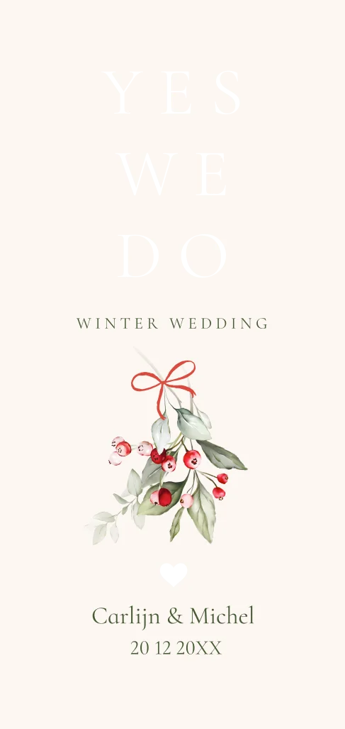 Winter Wedding trouwkaart langwerpig met maretak en goudfolie.