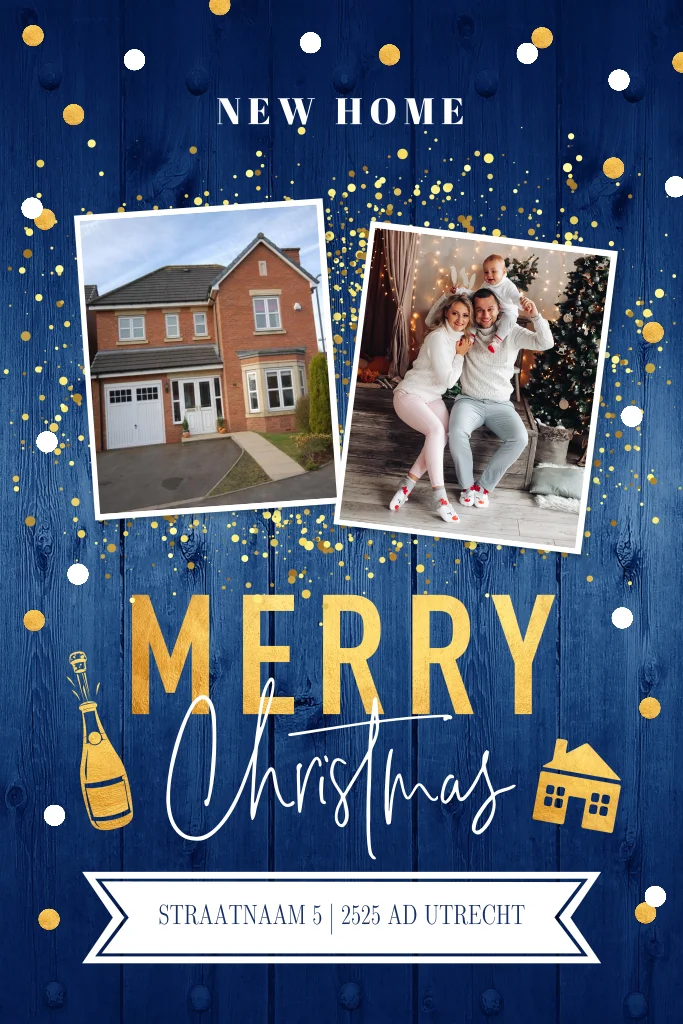Kerst verhuiskaart met foto's, blauw hout en goudlook. Geen folie!
