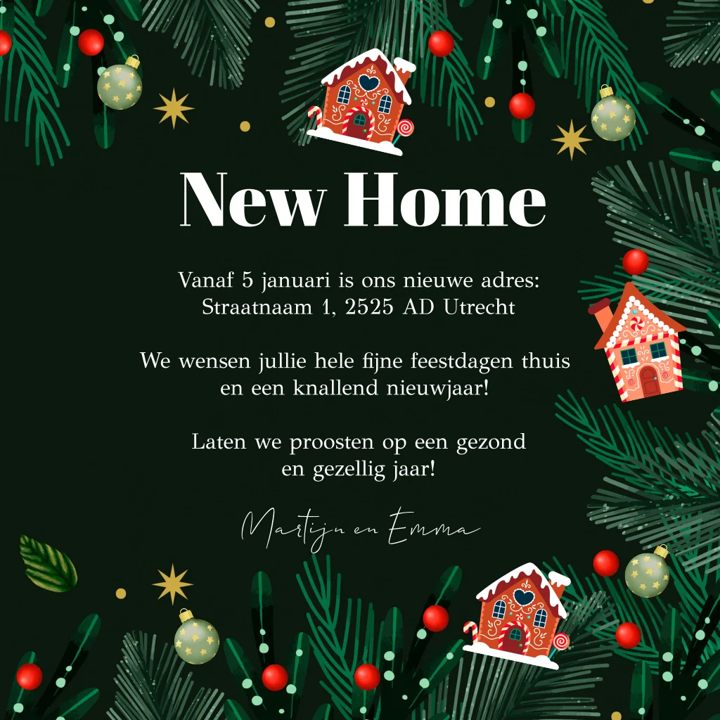 New Year New Home! Leuke kerstverhuiskaart met kersttakjes groen, vrolijke huisjes en kerstballen. Stuur deze prachtige super leuke kaart naar familie, vrienden of collega's!