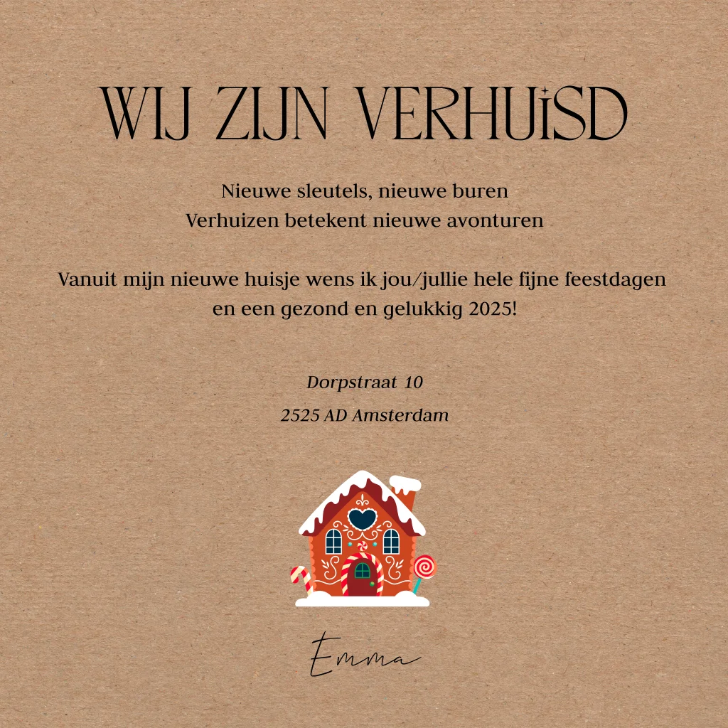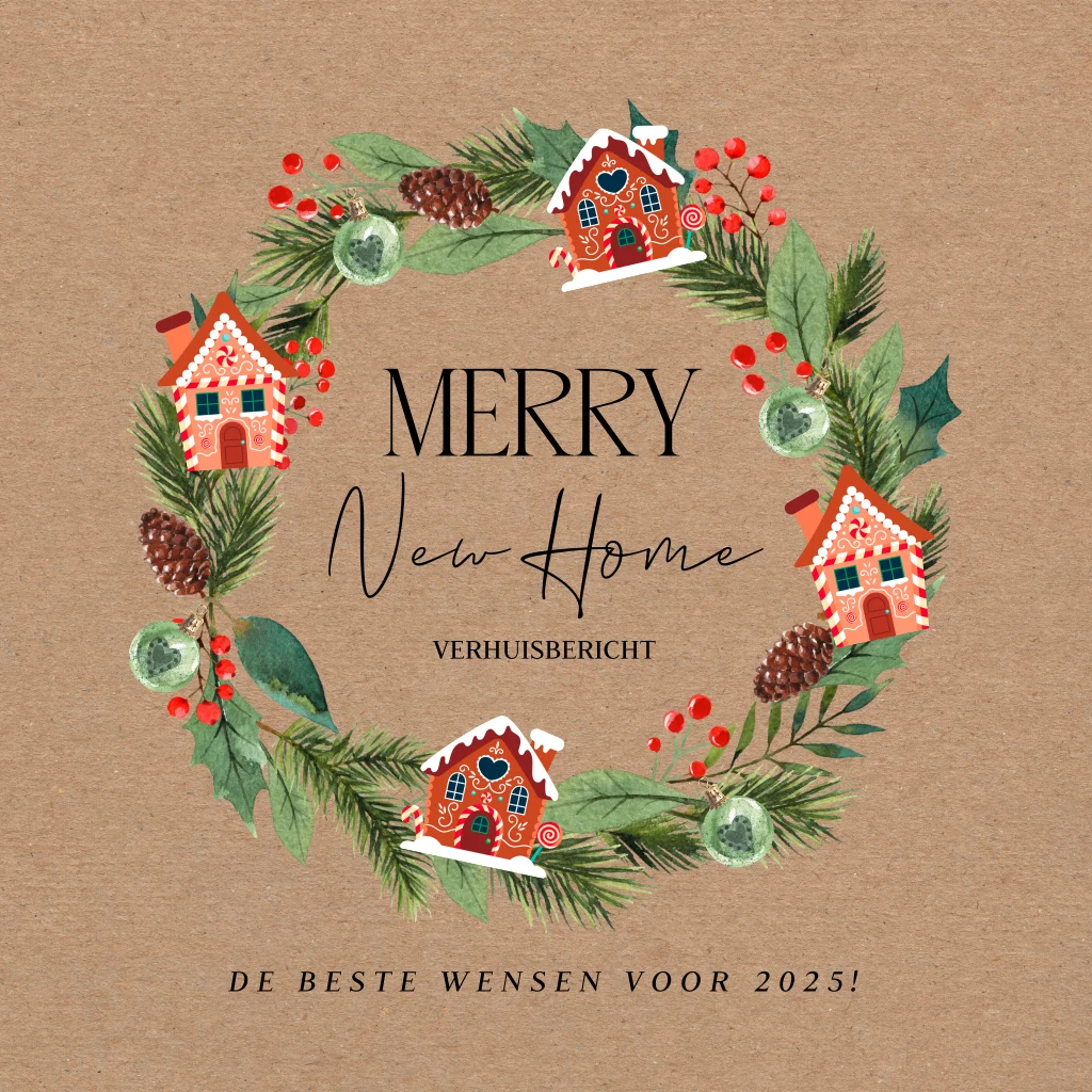 Mooie kerstverhuiskaart met kerstkrans, vrolijke huisjes en kraftlook achtergrond. Stuur deze prachtige kerstkaart naar familie, vrienden of collega's!