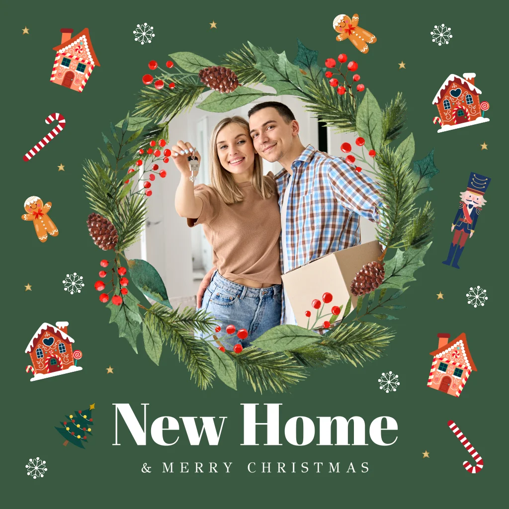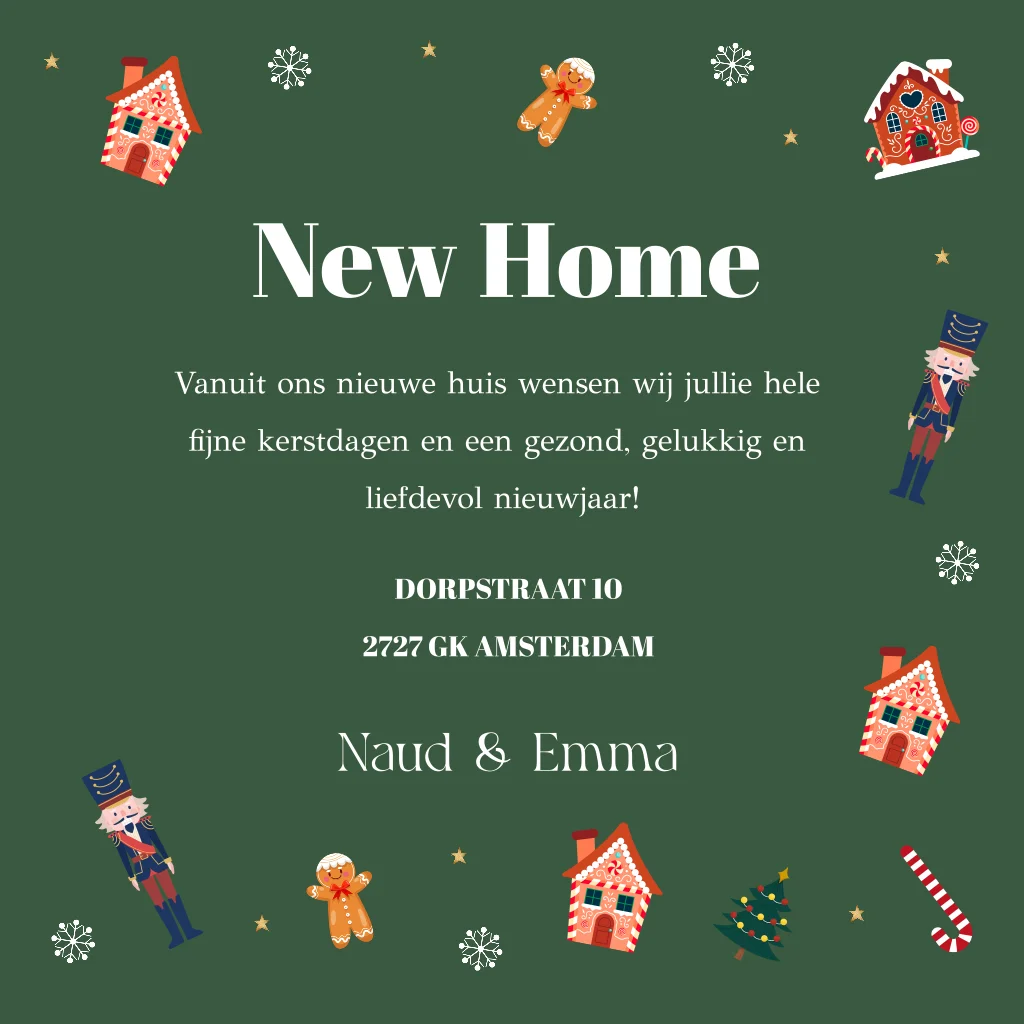 Kerst verhuiskaart groen met eigen foto en leuke kerstfiguurtjes. Combineer kerst en verhuiskaart in 1 kaart en stuur familie, vrienden of collega's deze leuke kerstverhuiskaart!