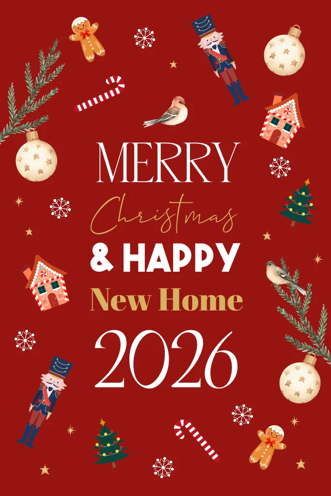 Kerst verhuiskaart rood met leuke kerstfiguurtjes.