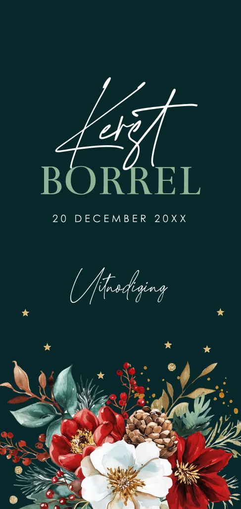 Kerstborrel uitnodiging langwerpig groen rood met kerst takjes en bloemen.