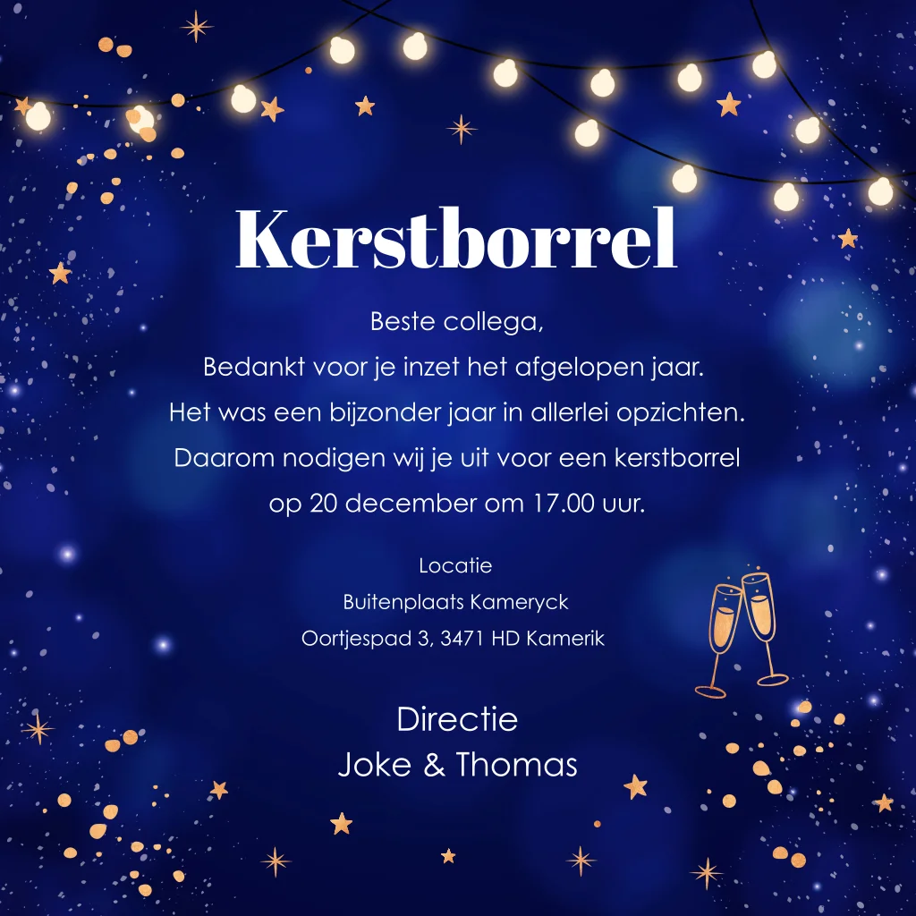 Sprankelende kerstborrel uitnodiging blauw met lampjes en koperlook spetters. Geen goudfolie/inkt!