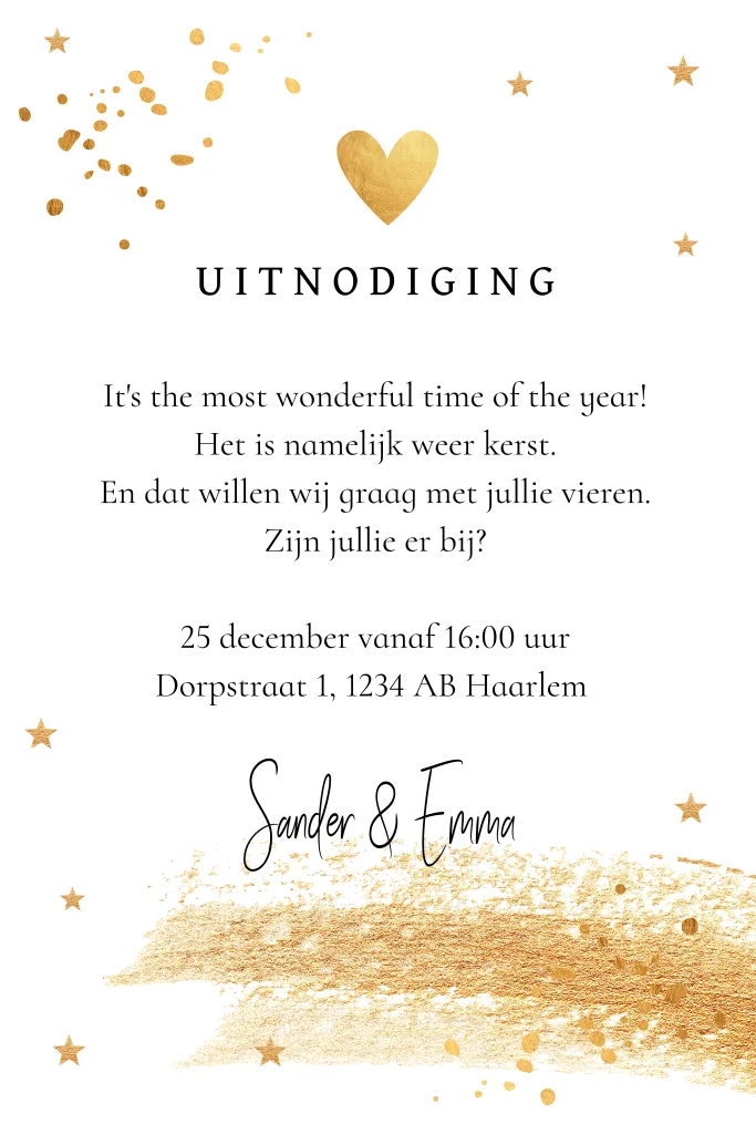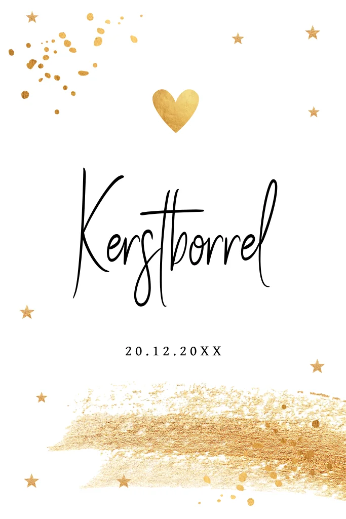 Kerstborrel uitnodiging goudlook brush/confetti. Geen goudfolie/inkt!