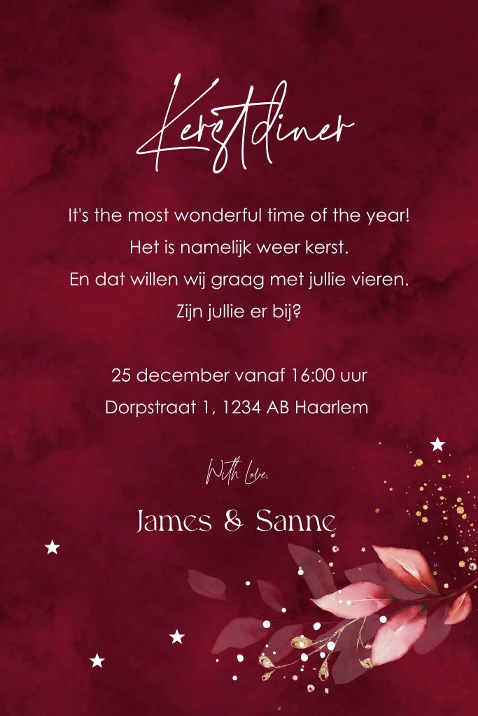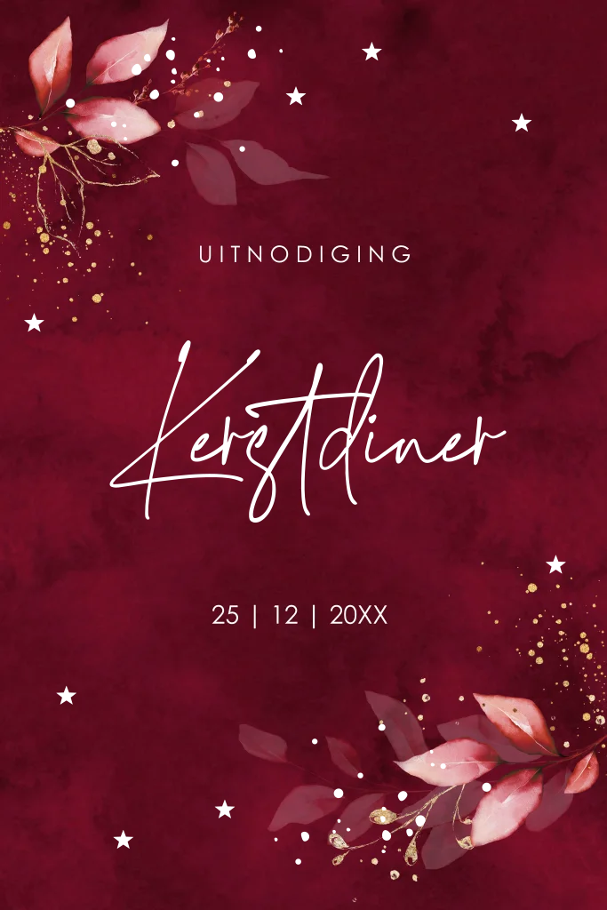 Mooie sprankelende kerstdiner uitnodiging rood met botanische bladeren, spetters en goudfolie.