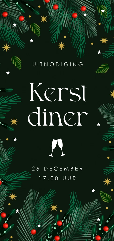 Kerstdiner uitnodiging groen zakelijk langwerpig met spetters sterren, champagneglazen en goudfolie. Nodig familie, vrienden of collega's uit voor een gezellig kerstdiner met deze mooie uitnodiging.