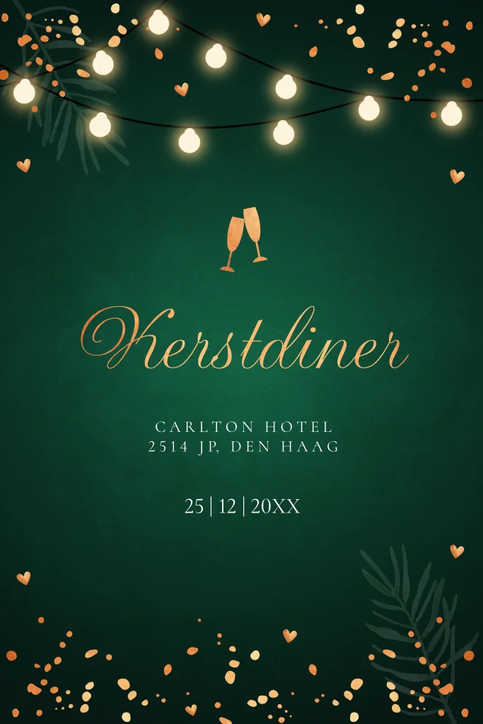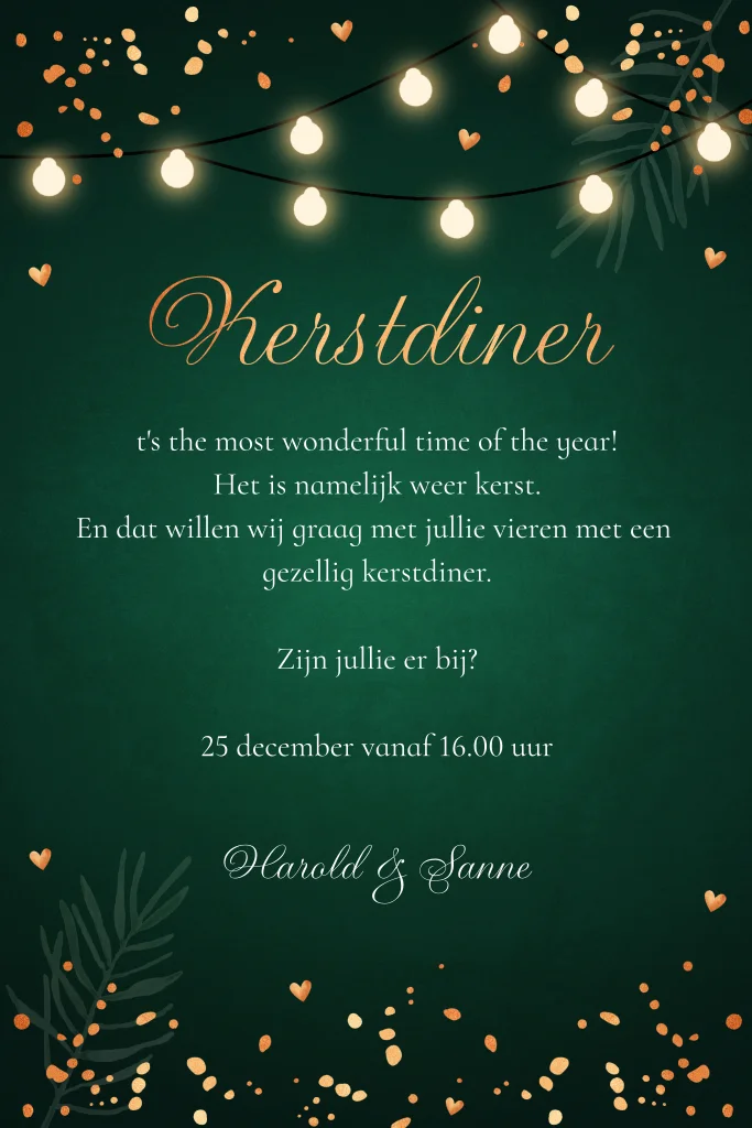 Kerstdiner uitnodiging groen met lampjes, spetters en koperlook. Geen folie! Nodig familie, vrienden of collega's uit voor een gezellig kerstdiner met deze mooie uitnodiging.