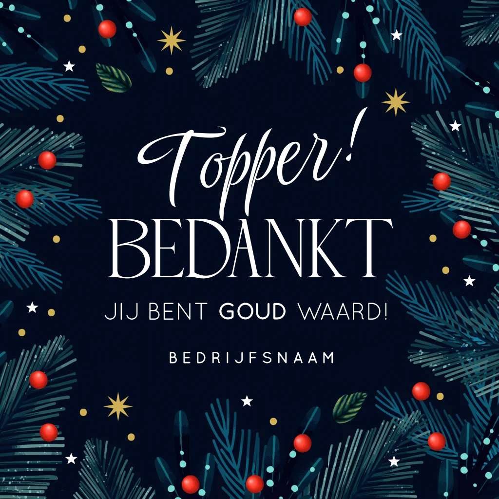 Een zakelijke kerstkaart blauw met kersttakjes en goudfolie om uw medewerkers te bedanken voor hun inzet het afgelopen jaar. Topper!