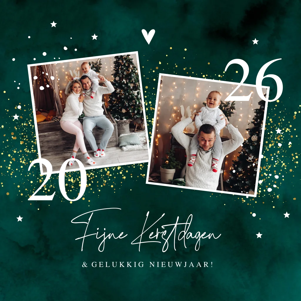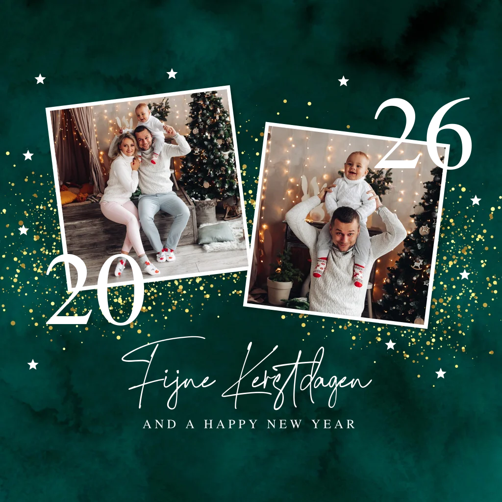 Op zoek naar een unieke kerstkaart om uw geliefden te verrassen? Ontdek onze prachtige kerstkaart met een groen ontwerp, voorzien van goudfolie en de mogelijkheid om uw eigen foto's toe te voegen, inclusief het jaartal 2026. Deze stijlvolle kerstkaart straalt warmte en feestelijkheid uit, perfect voor het vieren van de feestdagen. Het subtiele goud accenten geeft de kaart een luxe uitstraling.