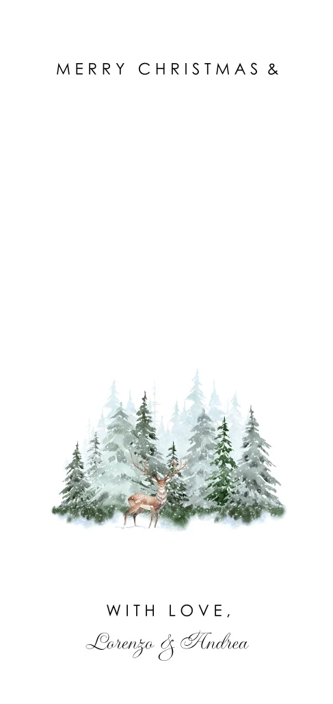 Kerstkaart langwerpig wit met winterlandschap bomen groen en goudfolie.