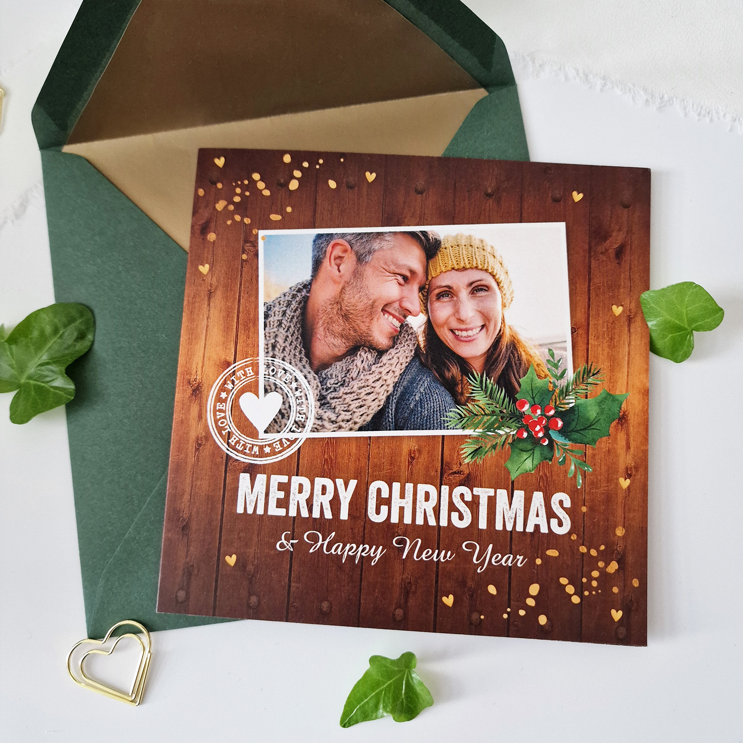 Mooie kerstkaart met eigen foto, warme hout look achtergrond en goudlook hartjes.