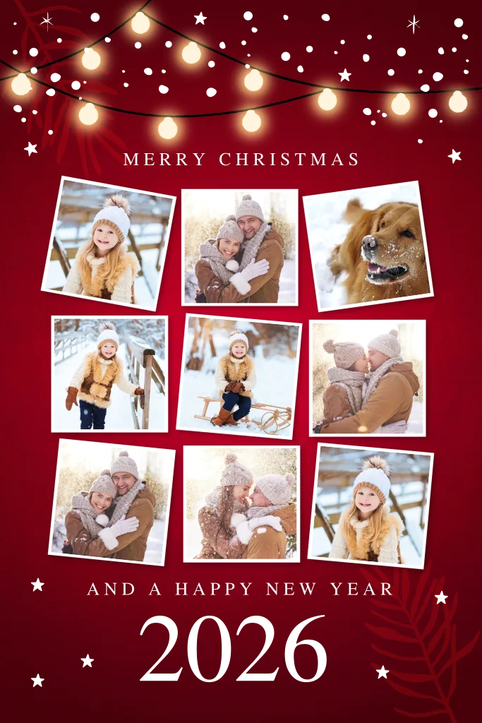 Kerstkaart rood met fotocollage, lampjes nen luxe goudfolie.