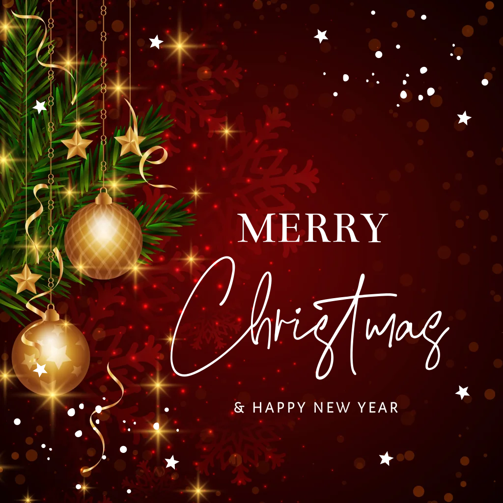 Sfeervolle kerstkaart rood met kerstballen en luxe goudfolie.
