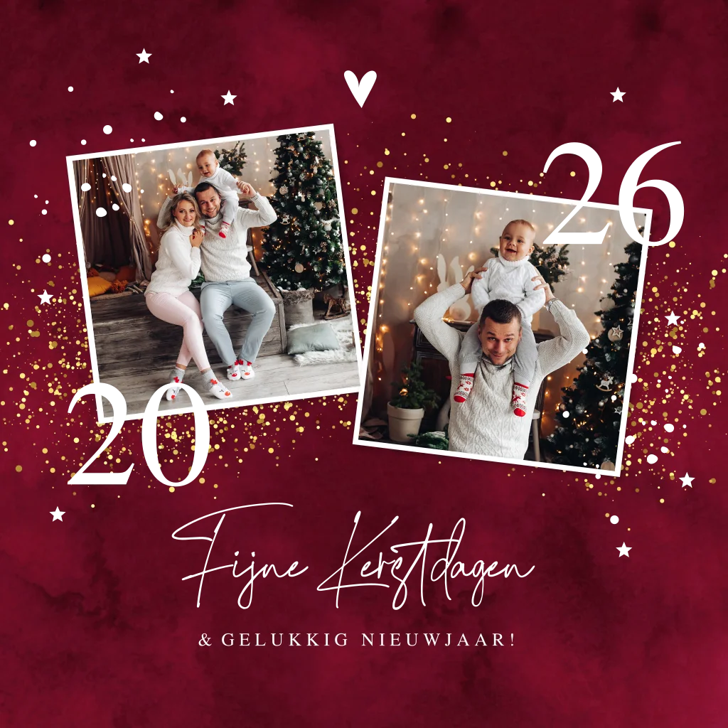 Luxe kerstkaart rood met foto's, confetti, sterren jaartal 2026 en goudfolie.