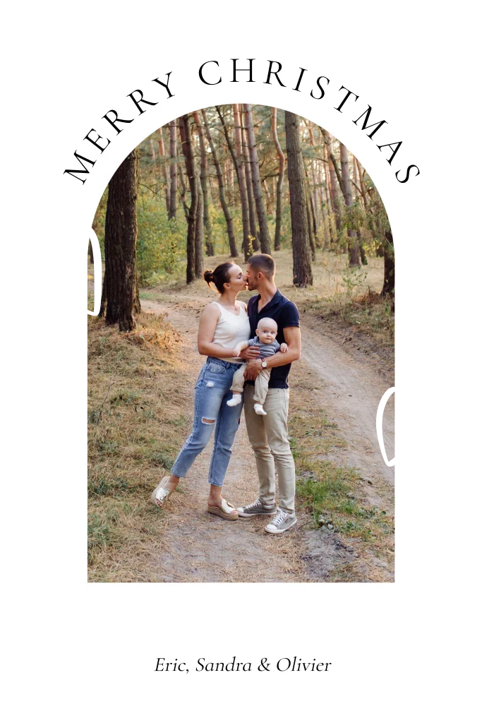 Kerstkaart wit foto boog hartjes goudfolie