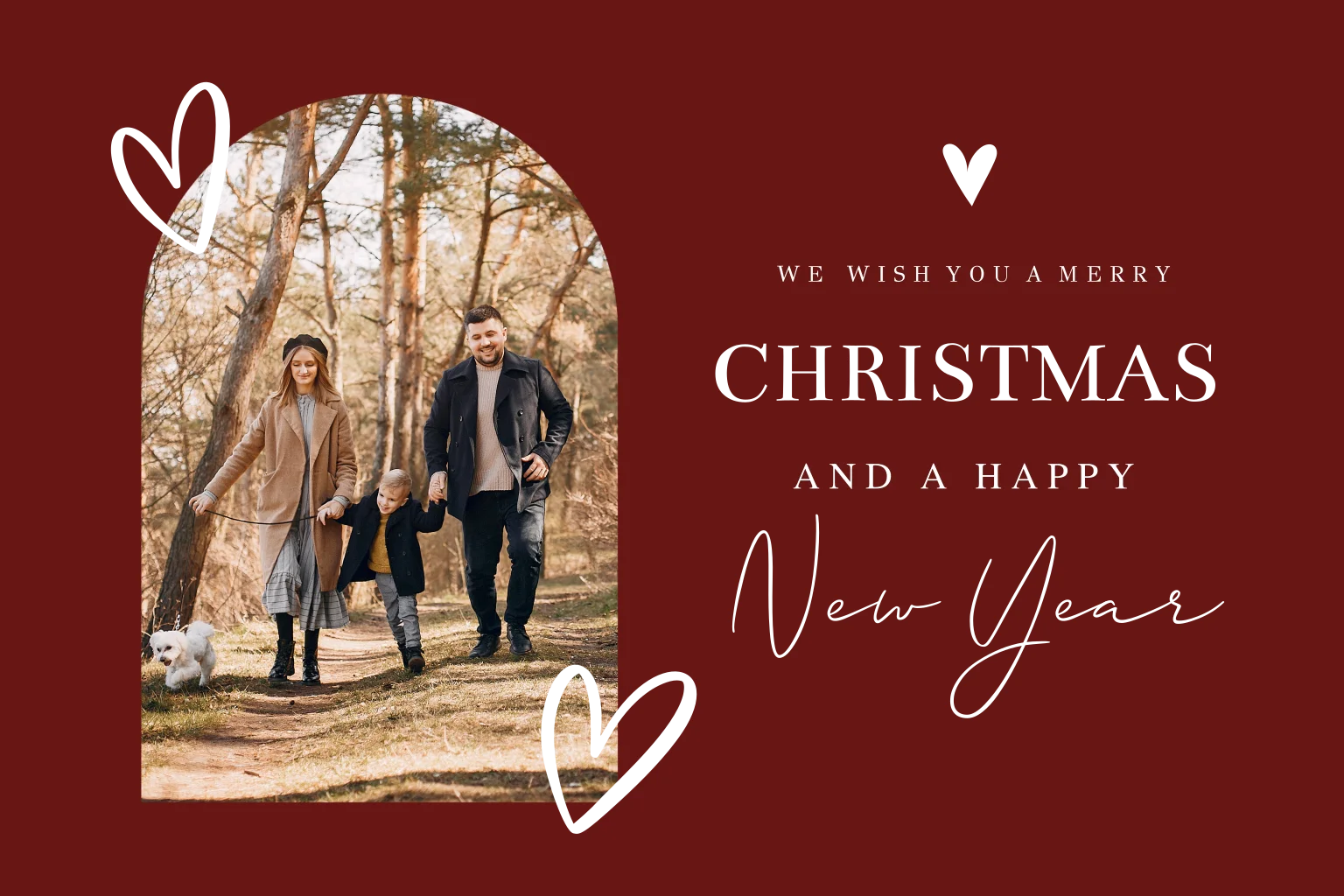 Stijlvolle kerstkaart rood met foto in boog vorm, hartjes en goudfolie.