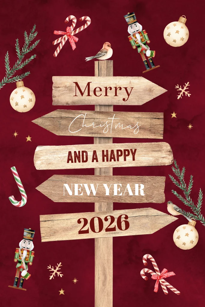 Kerstkaart rood met houten wegwijzer en leuke kerstfiguurtjes symbolen.