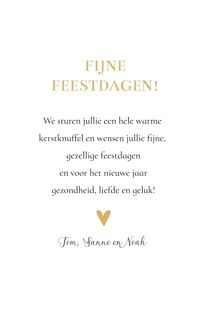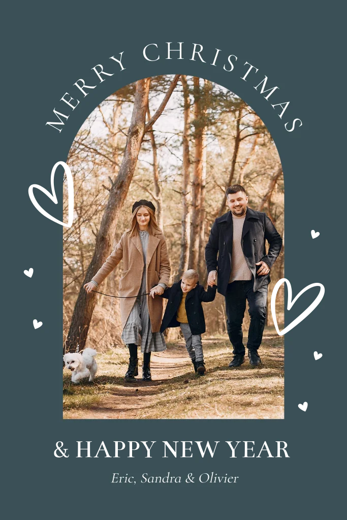 Kerstkaart blauw met foto boog hartjes goudfolie