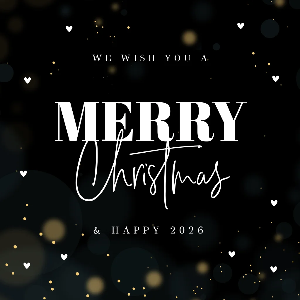 Kerstkaart zwart met goudfolie Merry Christmas en hartjes.
