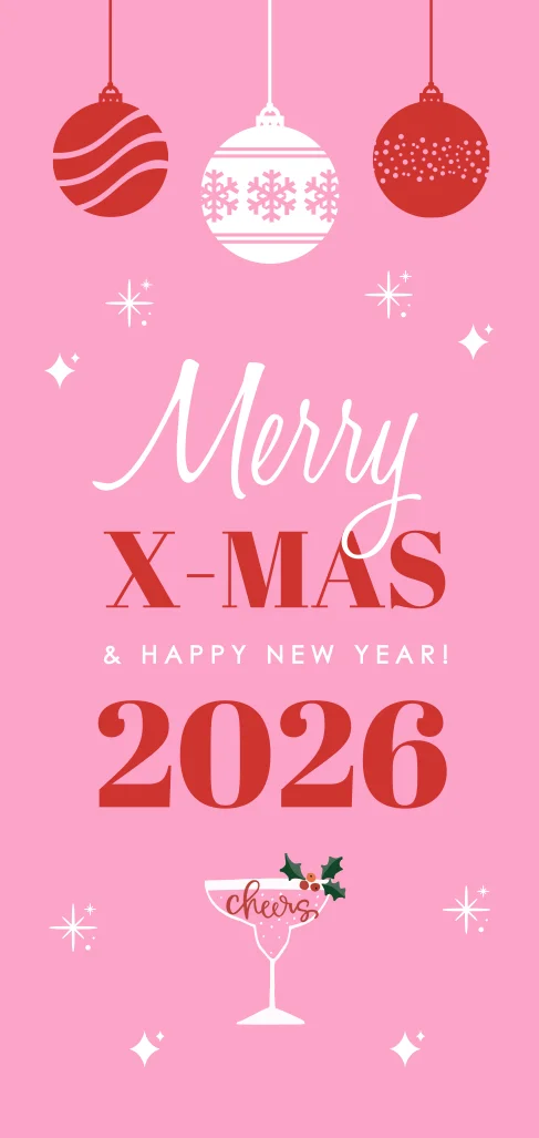 Kerstkaart langwerpig roze kerstballen rood modern typografie