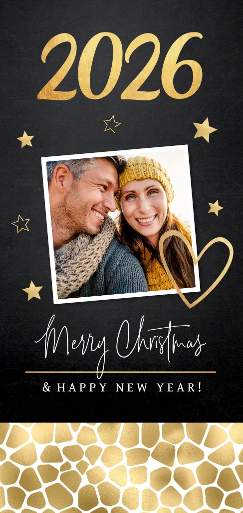 Kerstkaart langwerpig zwart met goudlook panterprint en jaartal 2026. Geen folie!