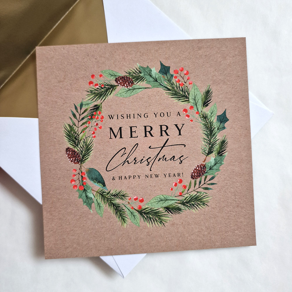 Mooie originele kerstkaart met kerstkrans, groene takjes en kraftlook achtergrond. Stuur deze prachtige kerstkaart naar familie, vrienden of collega's!