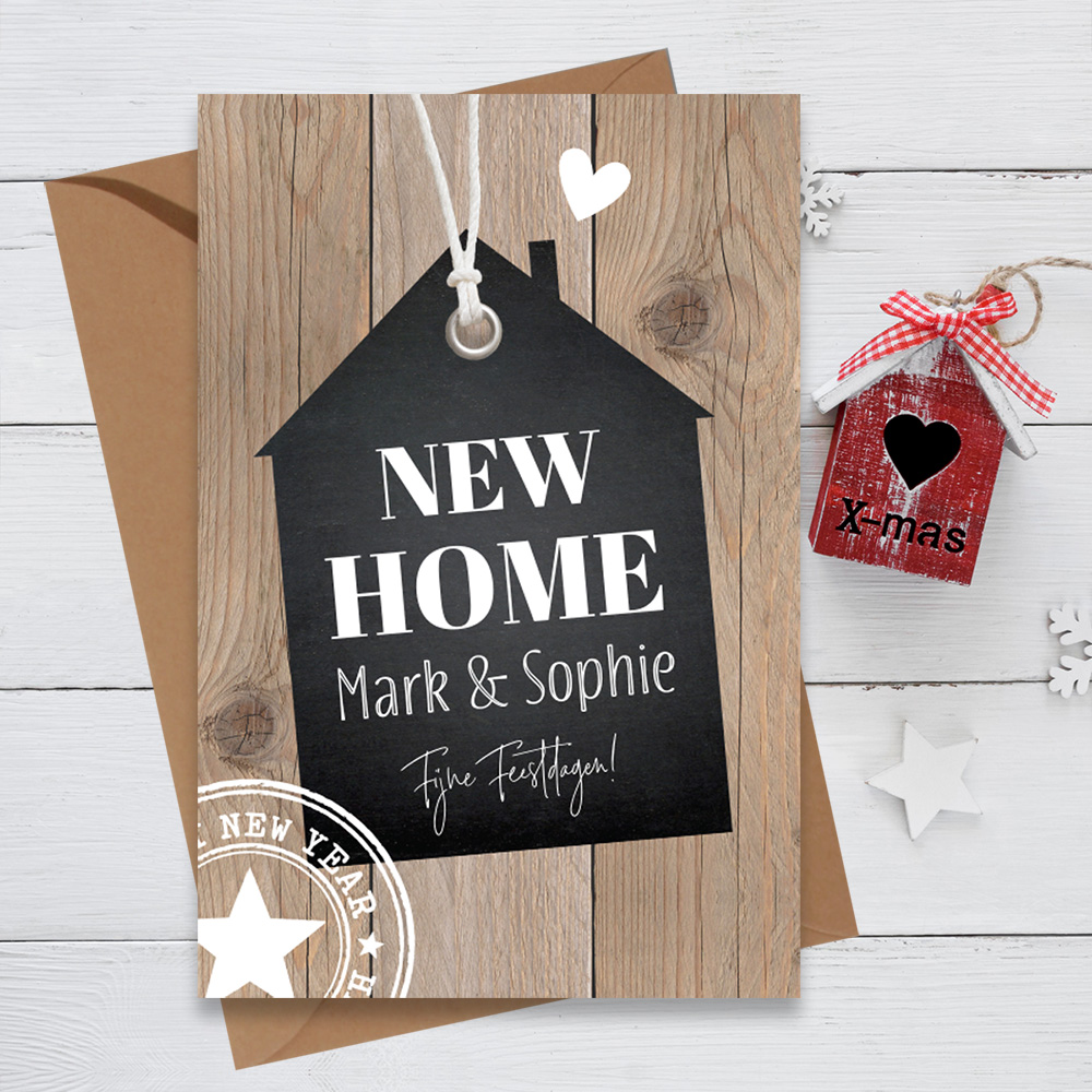 Kerstverhuiskaart met labelprint huisje zwart met houtlook achtergrond. Combineer kerst en verhuiskaart in 1 kaart en stuur familie, vrienden of collega's deze leuke kerstverhuiskaart!