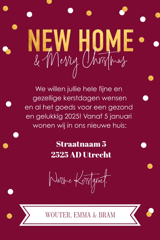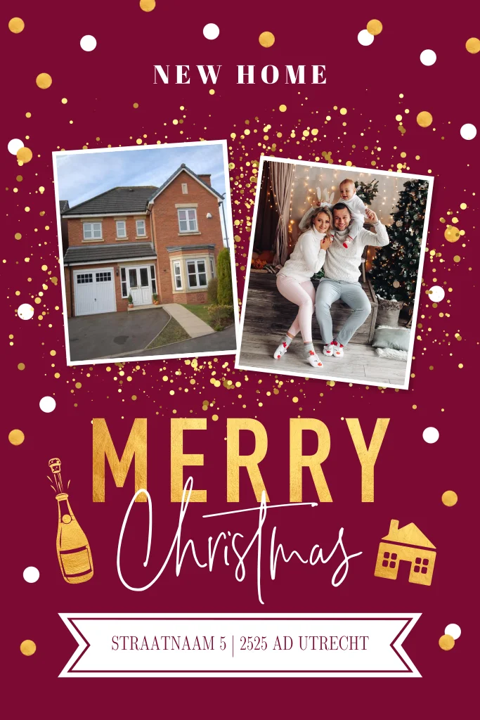 Kerst verhuiskaart rood met foto's, champagne en feestelijk goudlook confetti.