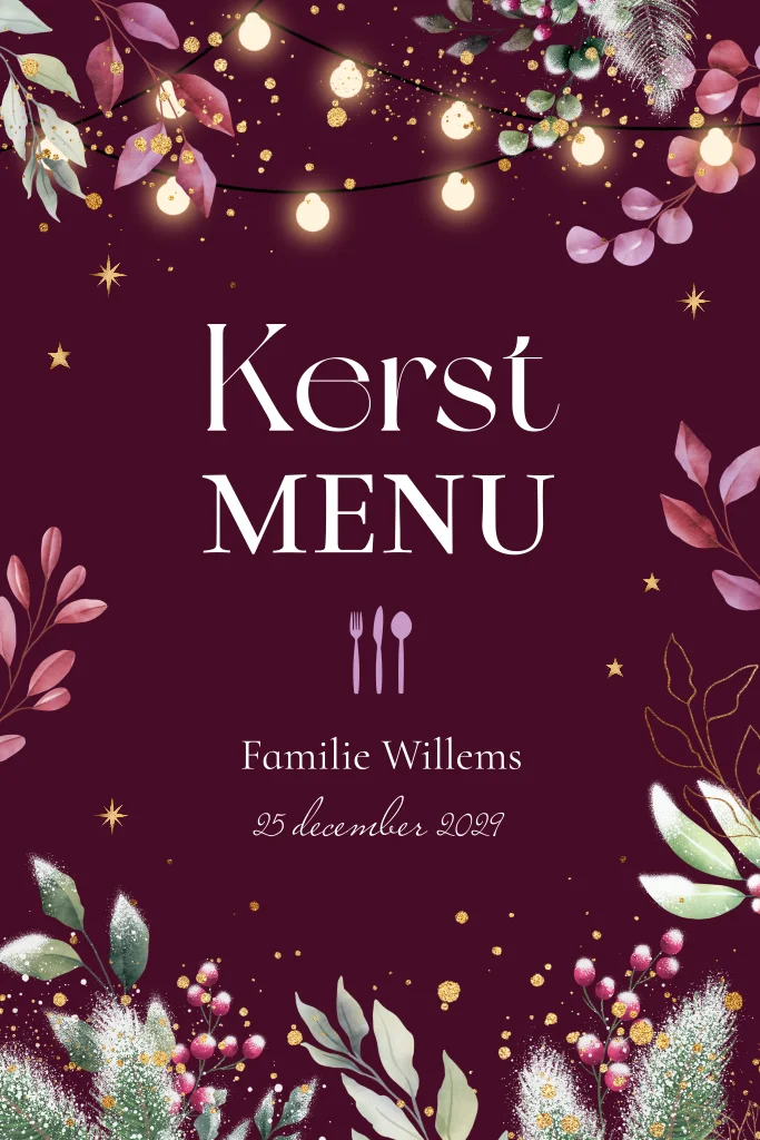 Kerstmenukaart botanisch bladeren aubergine met goudlook.