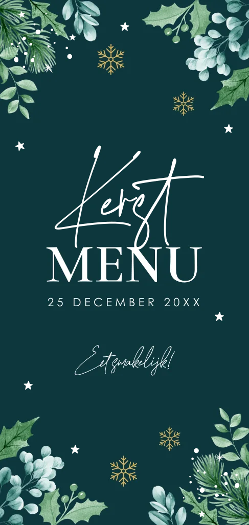 Maak je eigen kerstmenukaarten voor je kerstdiner! Kies voor deze prachtige kerstmenukaart langwerpig groen met waterverf kersttakjes en goudfolie.