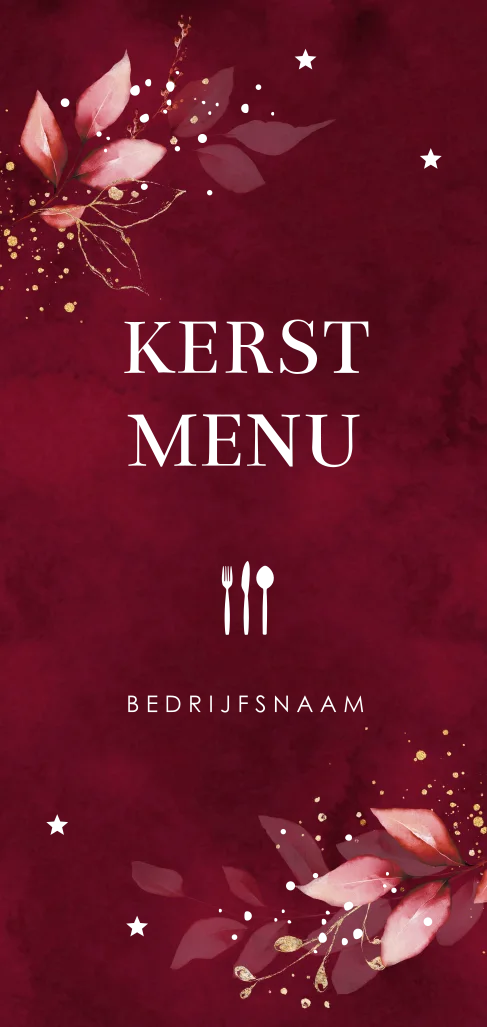 Maak je eigen kerstmenukaarten voor je kerstdiner! Kies voor deze prachtige kerstmenukaart langwerpig rood met botanische bladeren en goudfolie.