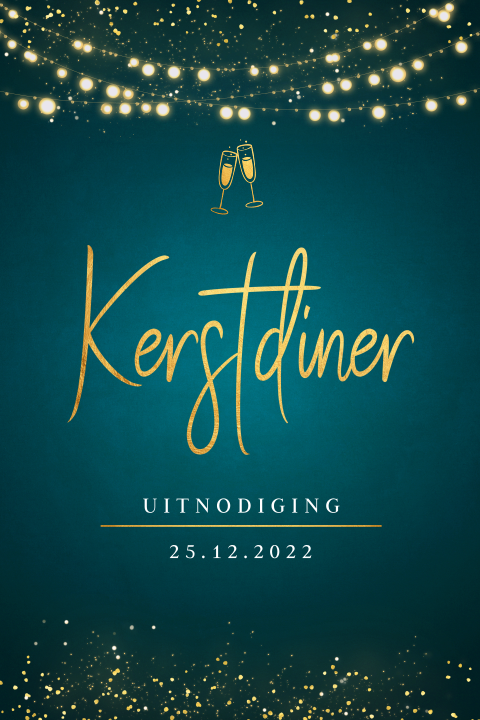 Maak je eigen kerstmenukaarten voor je kerstdiner! Kies voor deze prachtige kerstmenukaart langwerpig donkerblauw met champagneglazen, sfeervolle kersttakjes en goudfolie.