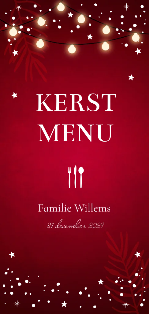 Kerstmenukaart rood langwerpig met lampjes en goudfolie.