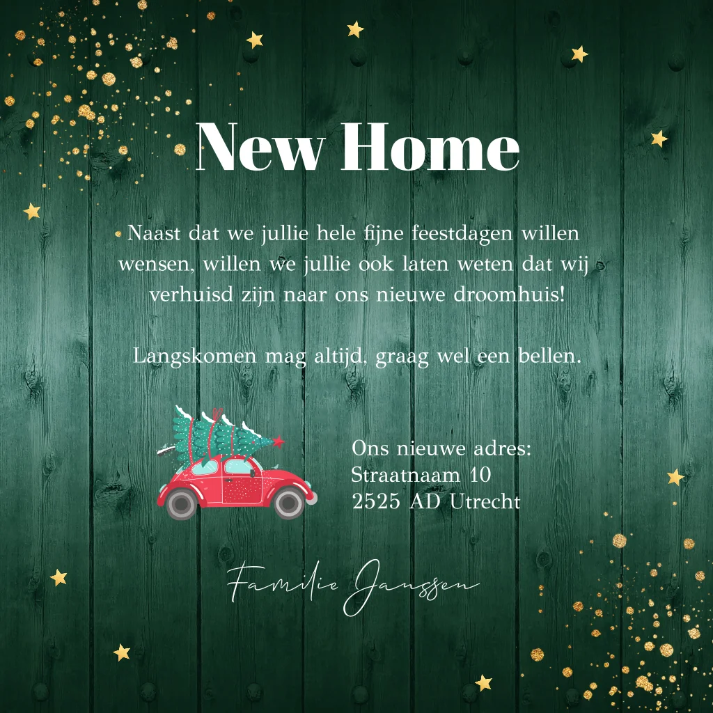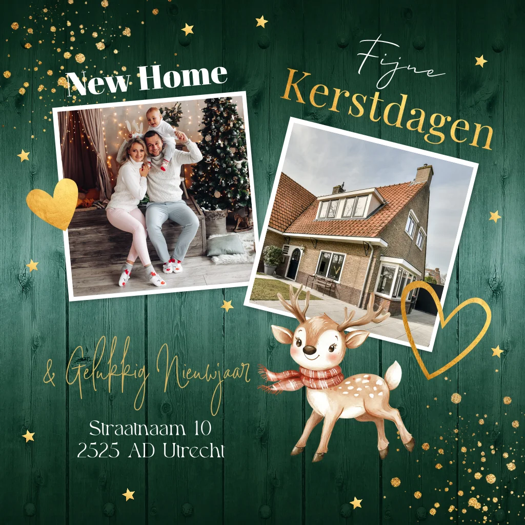 Kerst verhuiskaart groen hout met foto's goudlook en sterren. Geen goudfolie! Combineer kerst en verhuiskaart in 1 kaart en stuur familie, vrienden of collega's deze leuke kerstverhuiskaart!