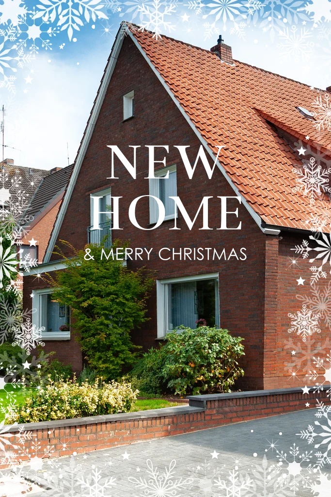 Kerstverhuiskaart met foto, witte sneeuwvlokken en goudfolie. Combineer kerst en verhuiskaart in 1 kaart en stuur familie, vrienden of collega's deze leuke kerstverhuiskaart!