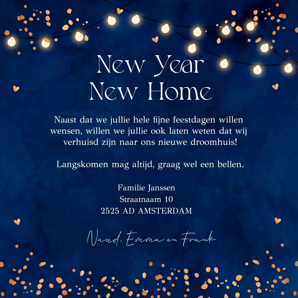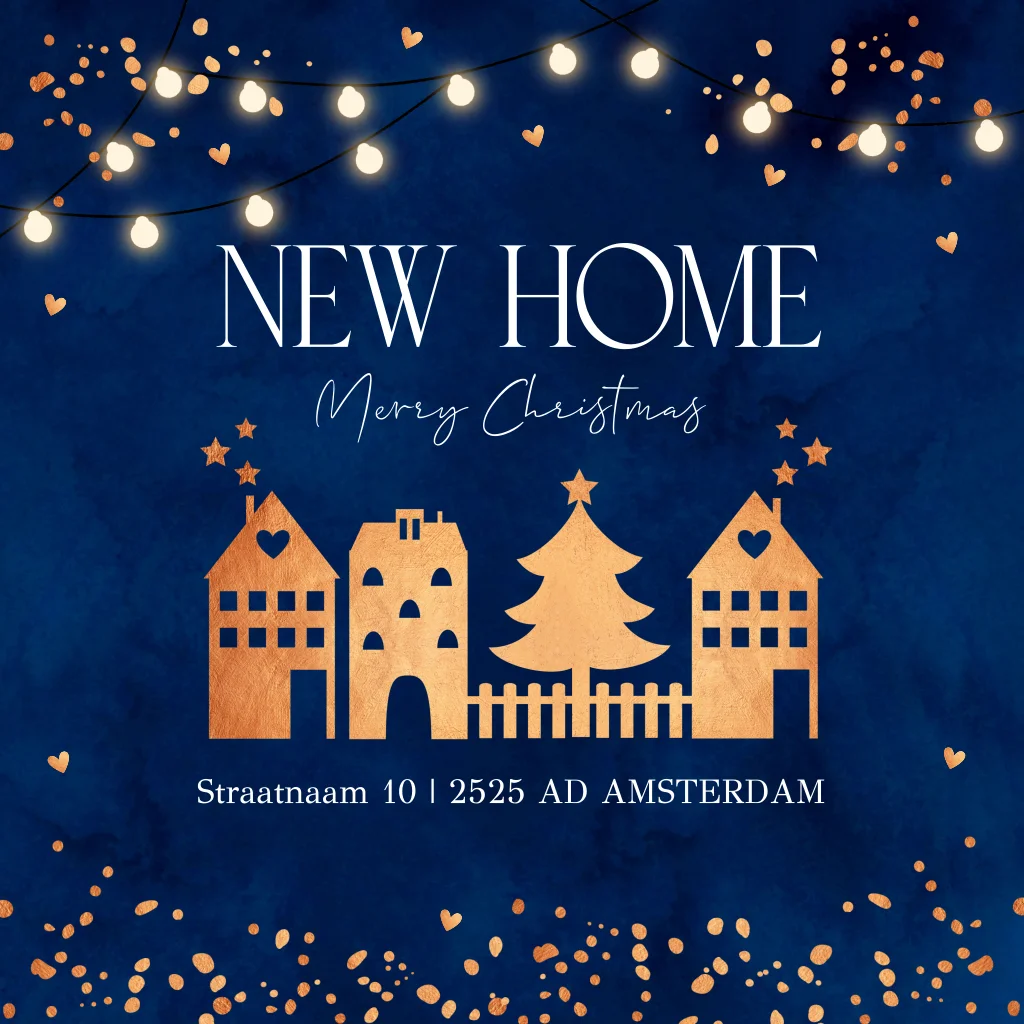 Kerst verhuiskaart blauw met lampjes, huisjes en spetters in koperlook. Geen folie! Combineer kerst en verhuiskaart in 1 kaart en stuur familie, vrienden of collega's deze leuke kerstverhuiskaart!