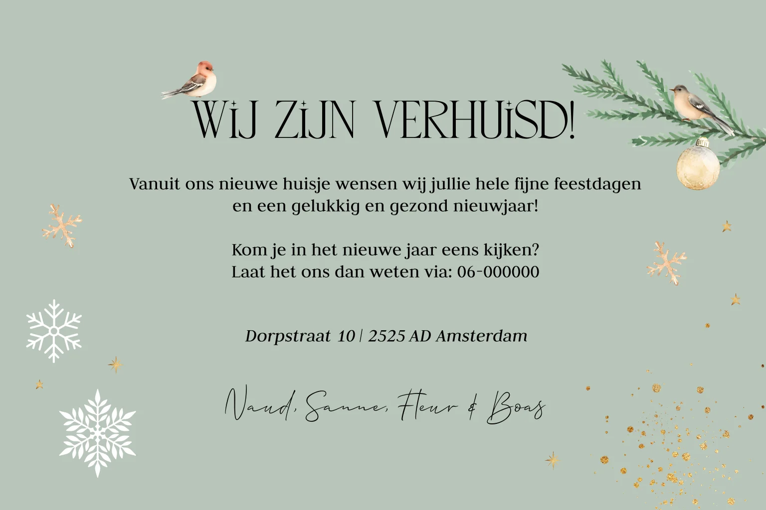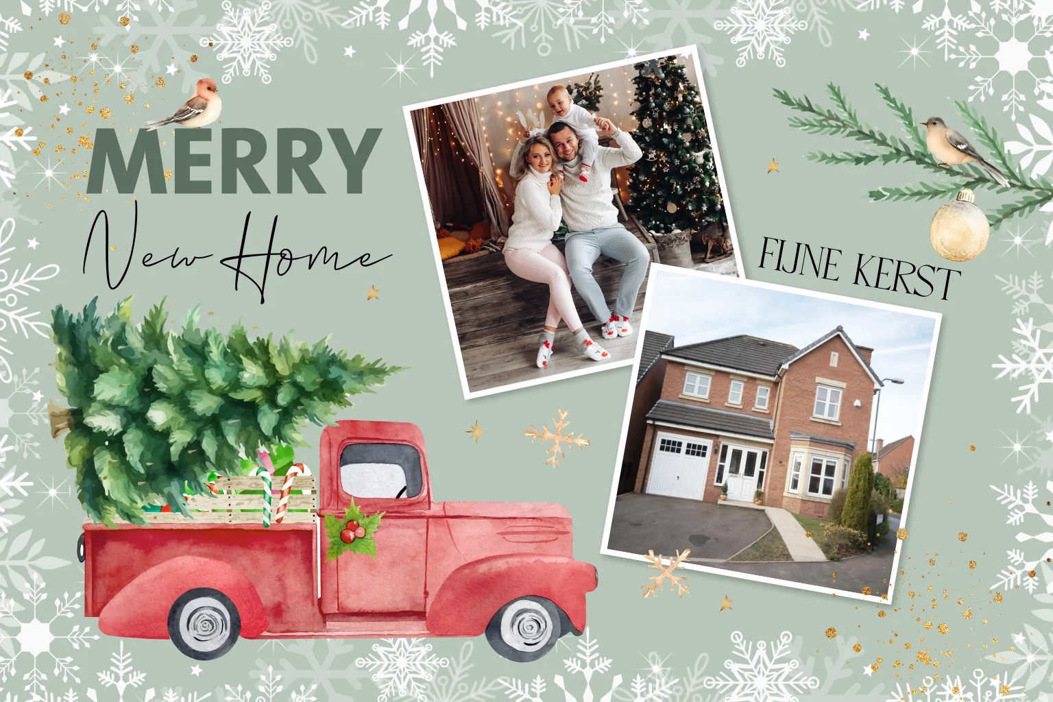 Kerst verhuiskaart met eigen foto' s, sneeuwvlokken en leuke kerstauto. Combineer kerst en verhuiskaart in 1 kaart en stuur familie, vrienden of collega's deze leuke kerstverhuiskaart!