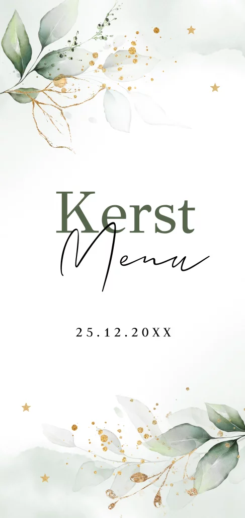 Maak je eigen kerstmenukaarten voor je kerstdiner! Kies voor deze prachtige kerstmenukaart langwerpig wit met groene waterverf bladeren en goudlook sterren.