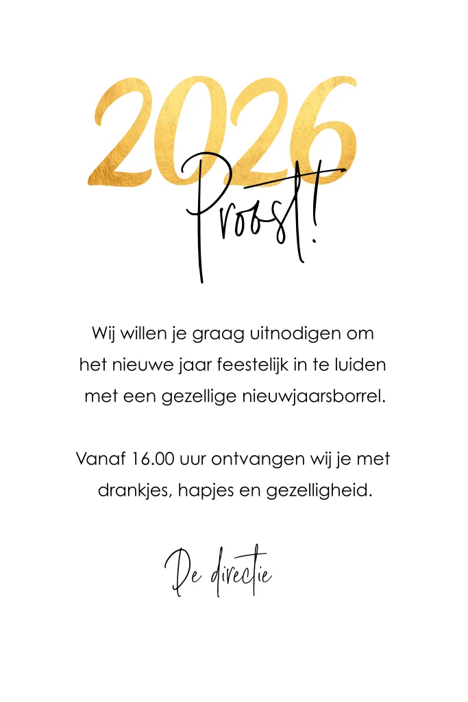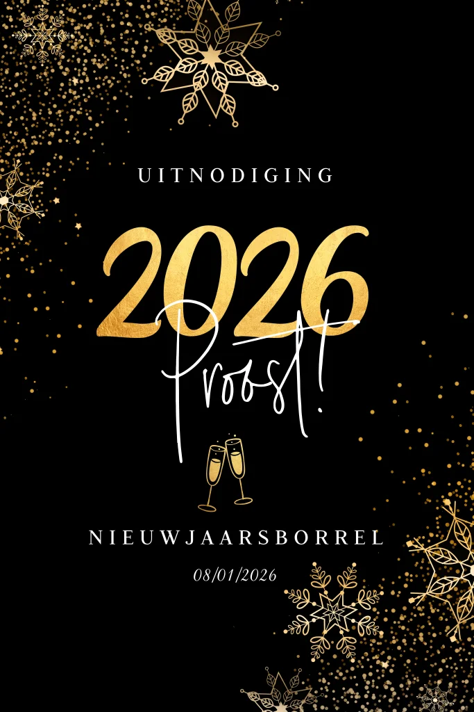 Zakelijke nieuwjaarsborrel uitnodiging zwart met goudlook sterren en champagneglazen.