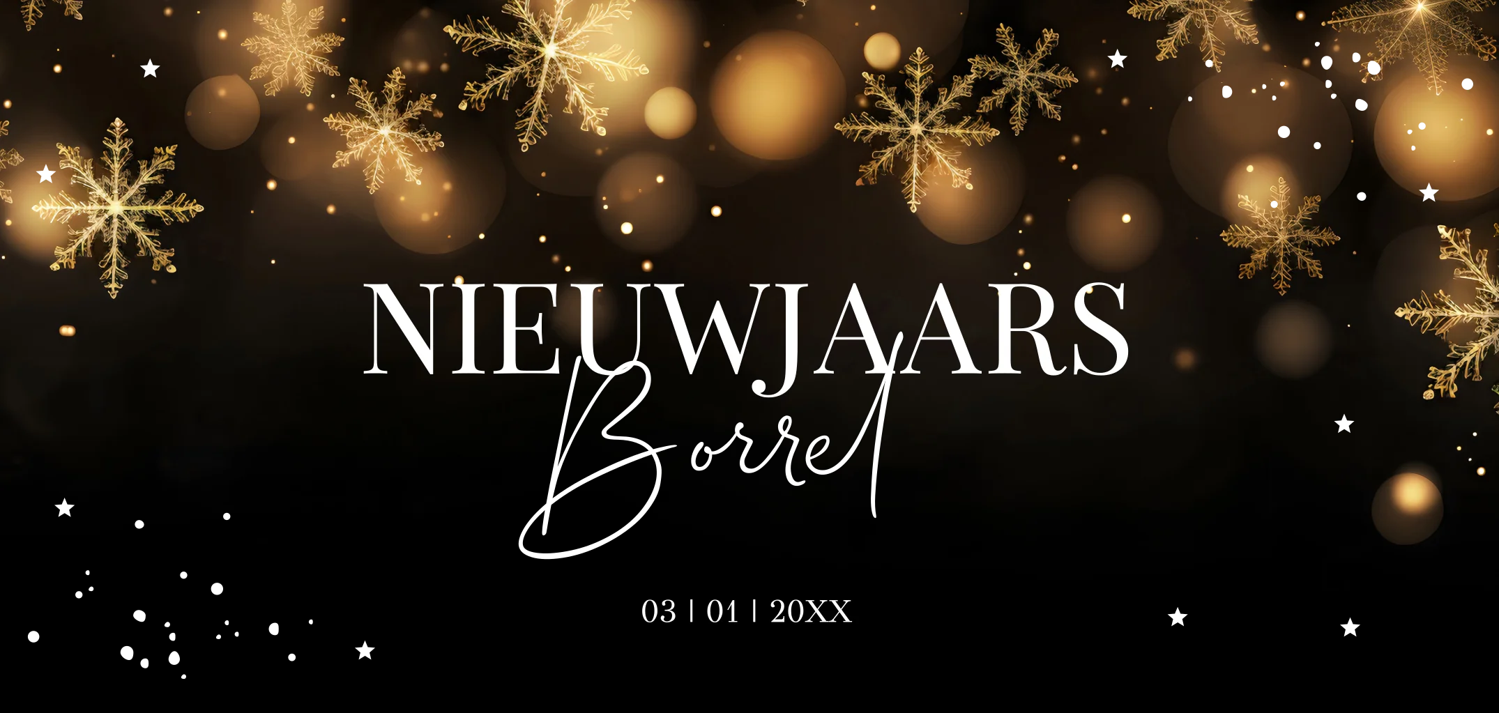 Nieuwjaarsborrel uitnodiging zwart met sneeuwvlokken en goudfolie.