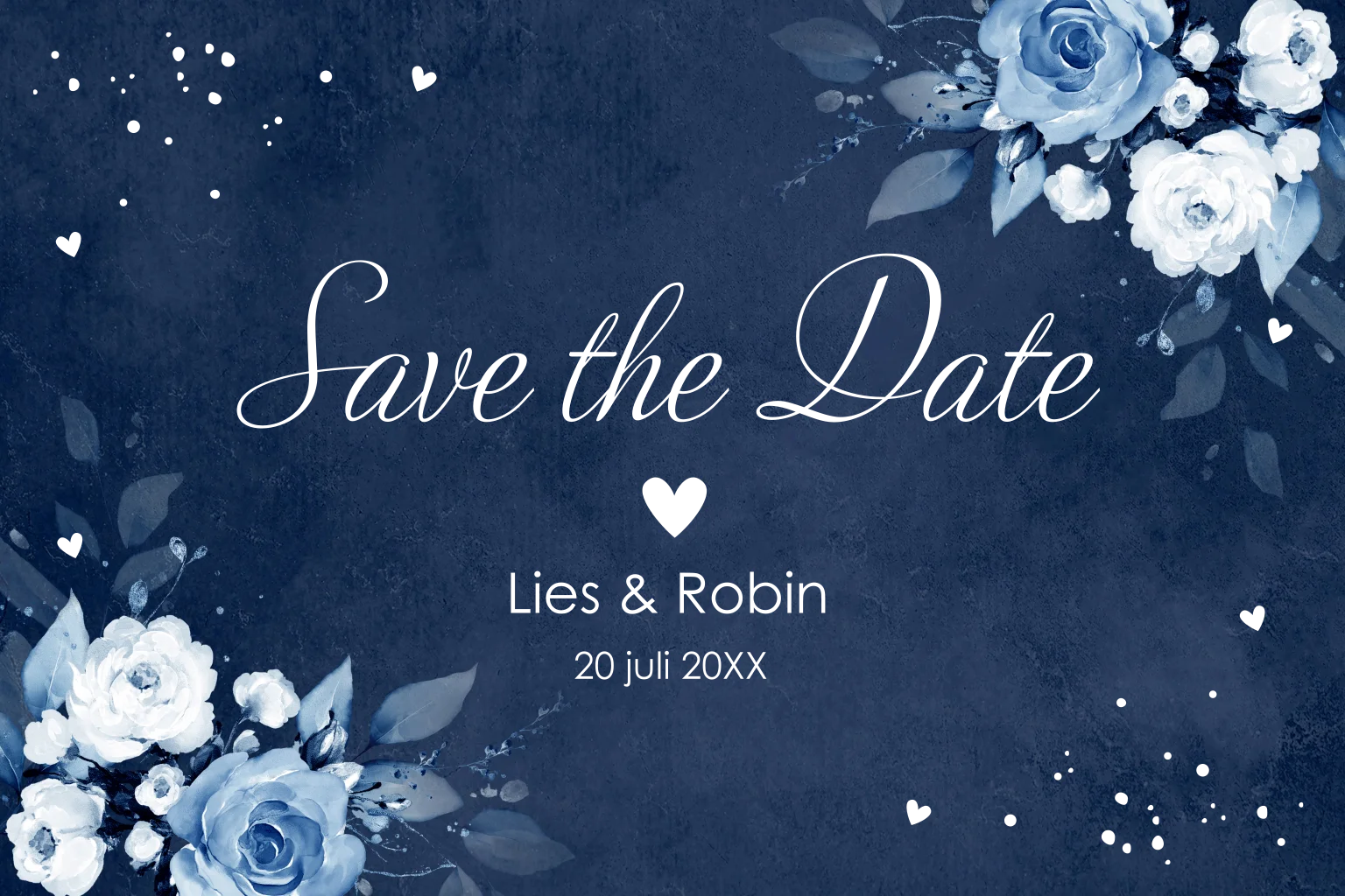 Stijlvolle Save the Date kaart donkerblauw met romantische watercolour bloemen en goudfolie.