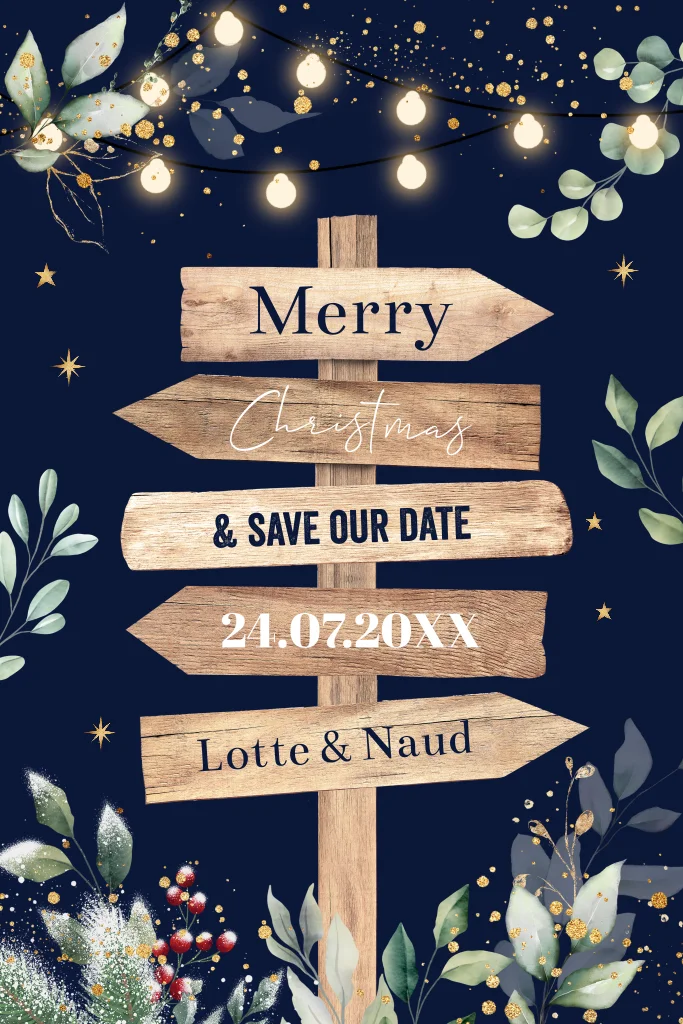 Save the Date kerstkaart botanisch groen houten wegwijzer