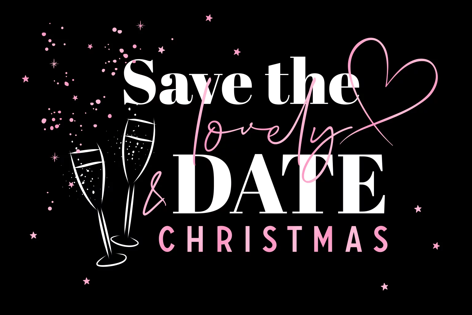 Save the Date kerstkaart zwart met mooie typografie, champagneglazen, hartje en roze hoogglans.
