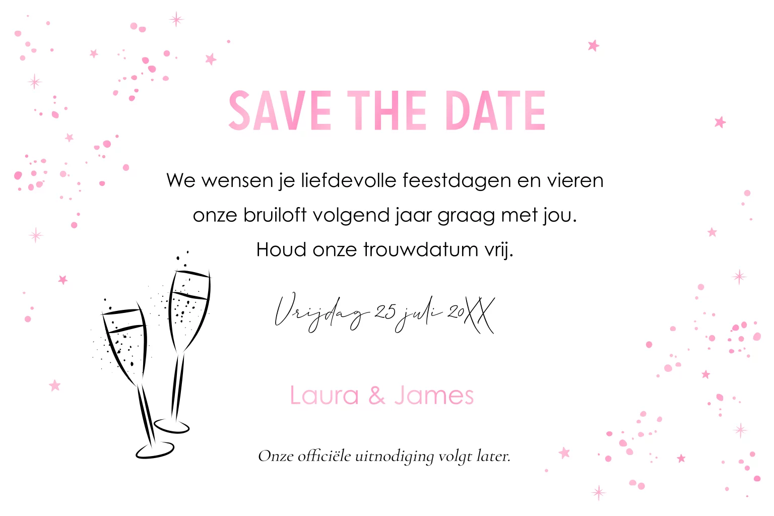 Save the Date kerstkaart champagne hartje zwart roze hoogglans
