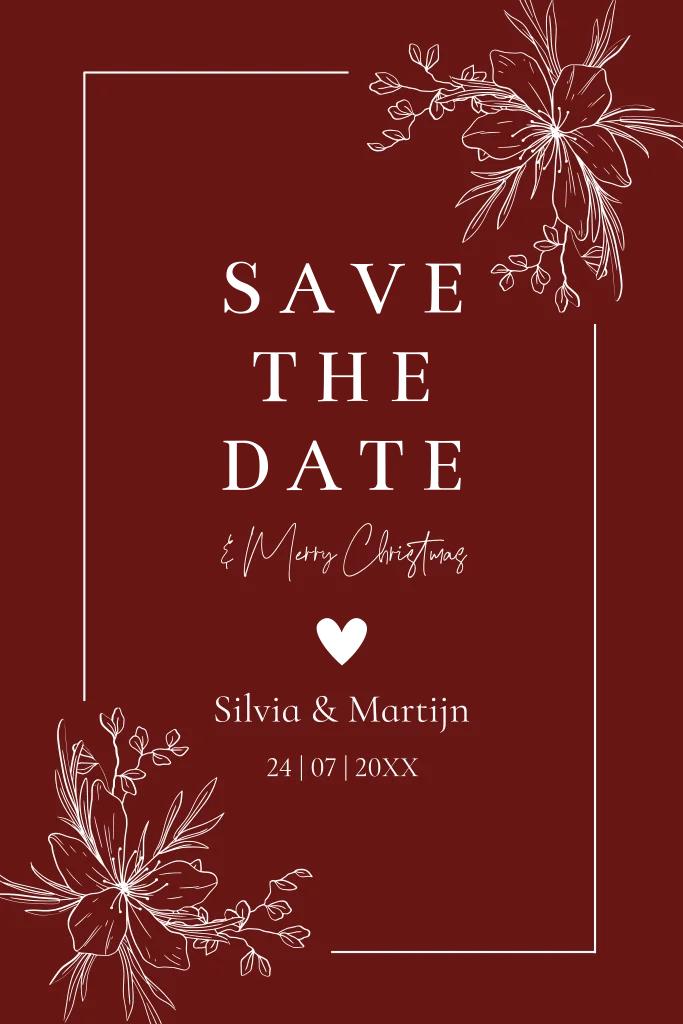 Save the Date kerstkaart rood met bloemen kader en goudfolie. Maak jullie trouwdatum bekend met een save the date kaart en kerstkaart in één!