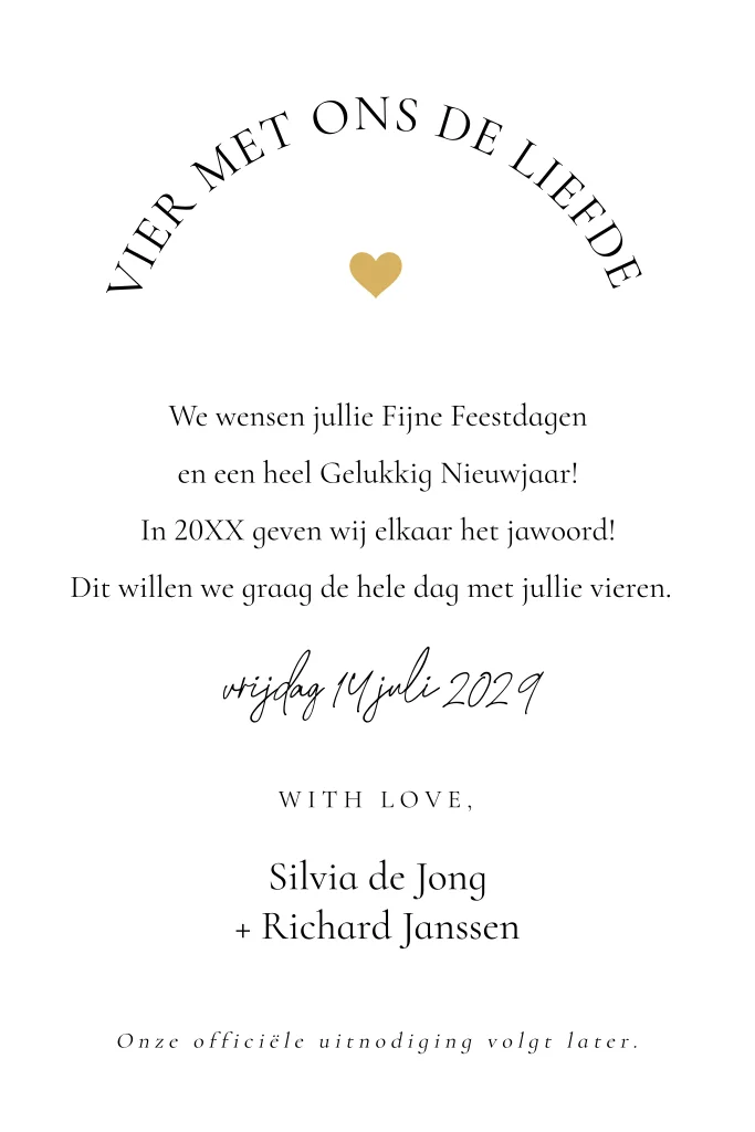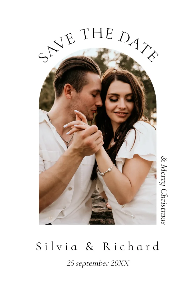Save the Date kerstkaart wit met foto in boog vorm.