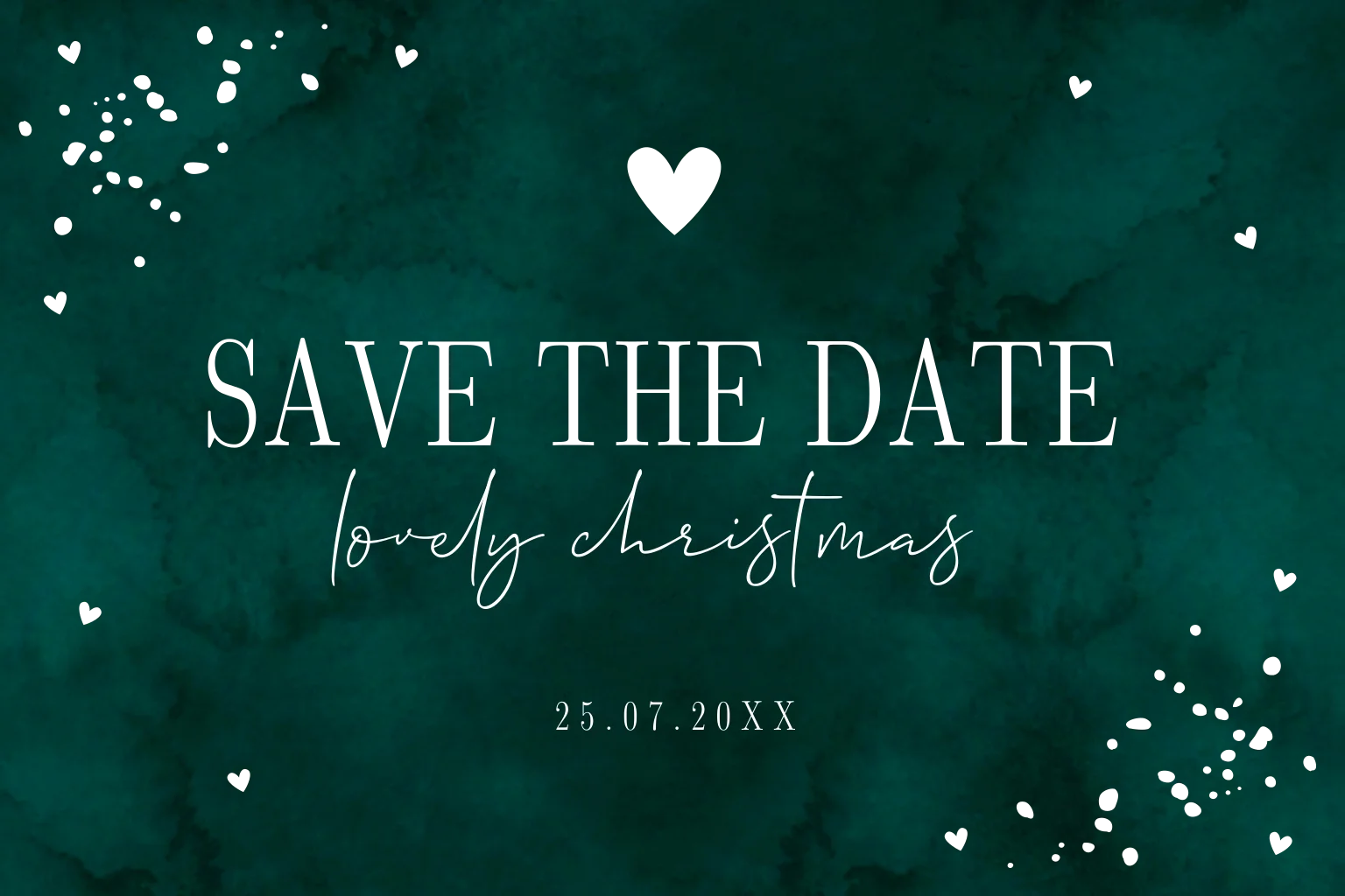 Mooie stijlvolle Save the Date kerstkaart donkergroen met goudfolie spetters.