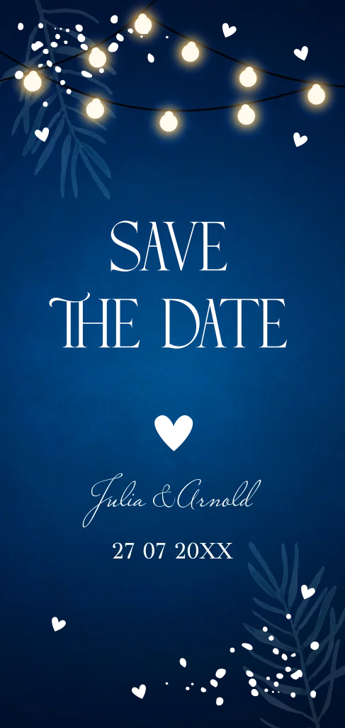 Save the Date kerstkaart blauw langwerpig met goudfolie hartjes en sfeervolle lampjes.